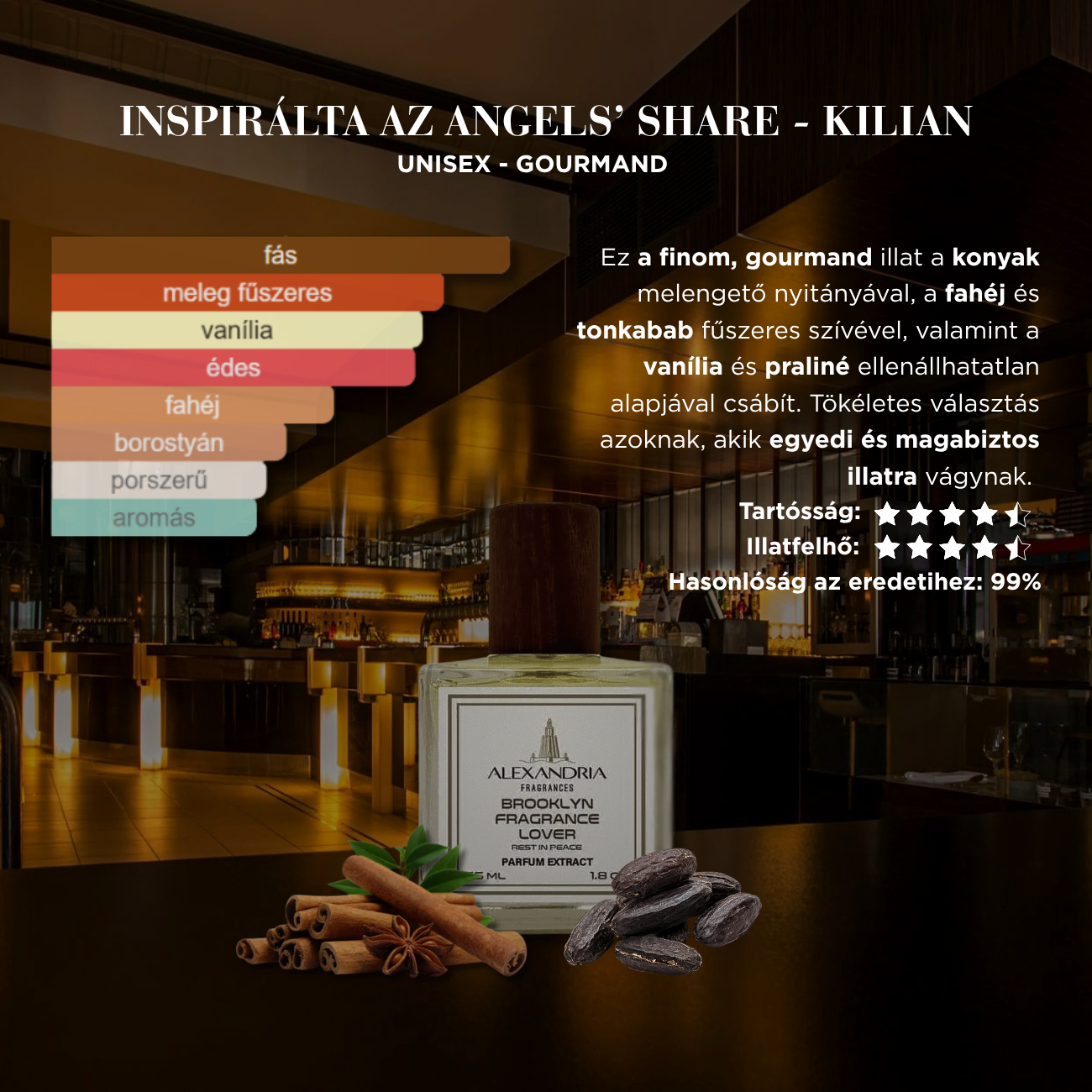 Ez a finom, gourmand illat a konyak melengető nyitányával, a fahéj és tonkabab fűszeres szívével, valamint a vanília és praliné ellenállhatatlan alapjával csábít. Tökéletes választás azoknak, akik egyedi és magabiztos illatra vágynak.