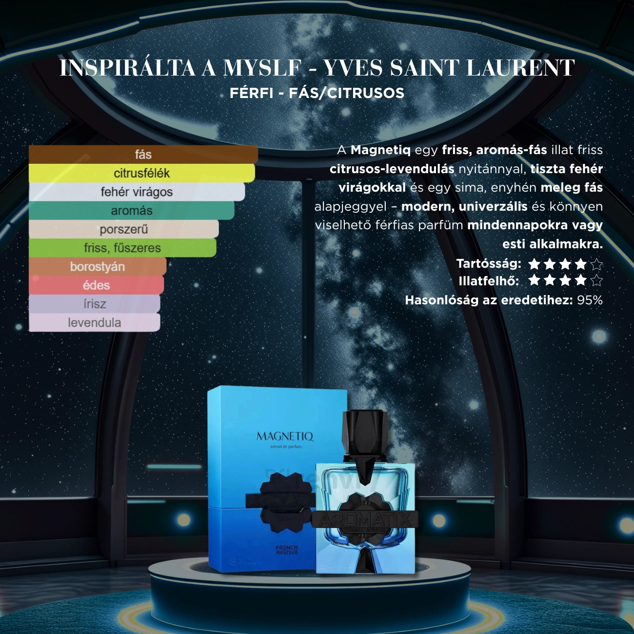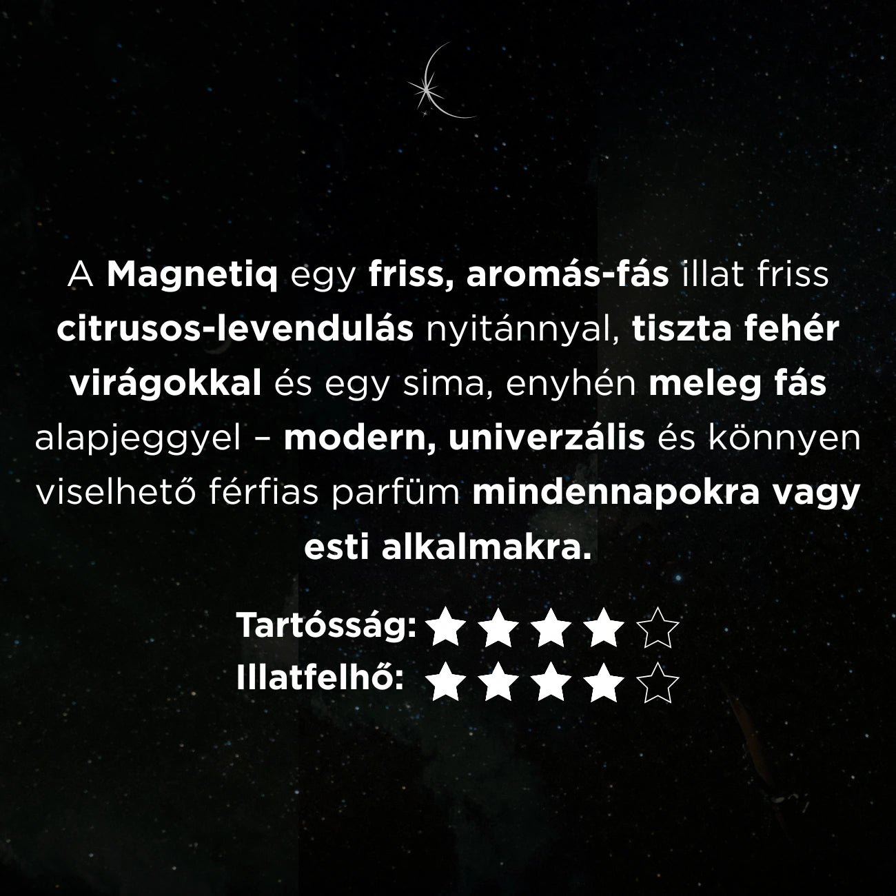 A Magnetiq egy friss, aromás-fás illat friss citrusos-levendulás nyitánnyal, tiszta fehér virágokkal és egy sima, enyhén meleg fás alapjeggyel – modern, univerzális és könnyen viselhető férfias parfüm mindennapokra vagy esti alkalmakra.