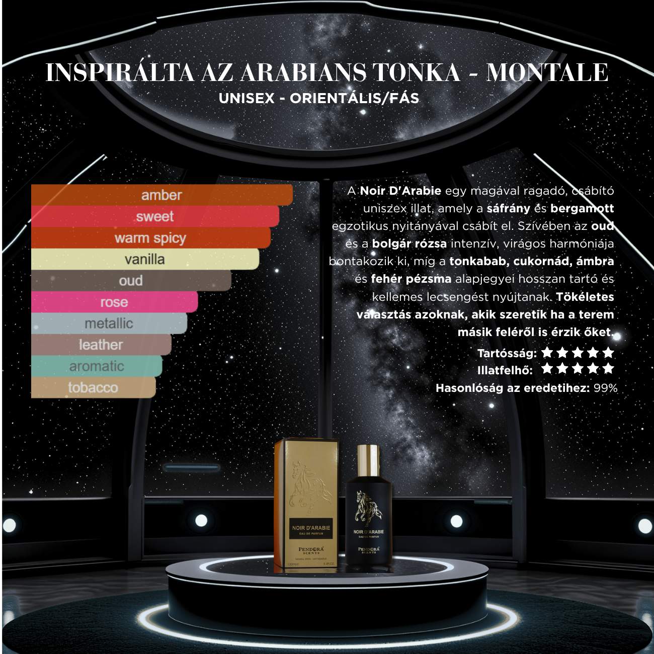 A Noir D'Arabie egy magával ragadó, csábító uniszex illat, amely a sáfrány és bergamott egzotikus nyitányával csábít el. Szívében az oud és a bolgár rózsa intenzív, virágos harmóniája bontakozik ki, míg a tonkabab, cukornád, ámbra és fehér pézsma alapjegyei hosszan tartó és kellemes lecsengést nyújtanak. Tökéletes választás azoknak, akik szeretik ha a terem másik feléről is érzik őket.