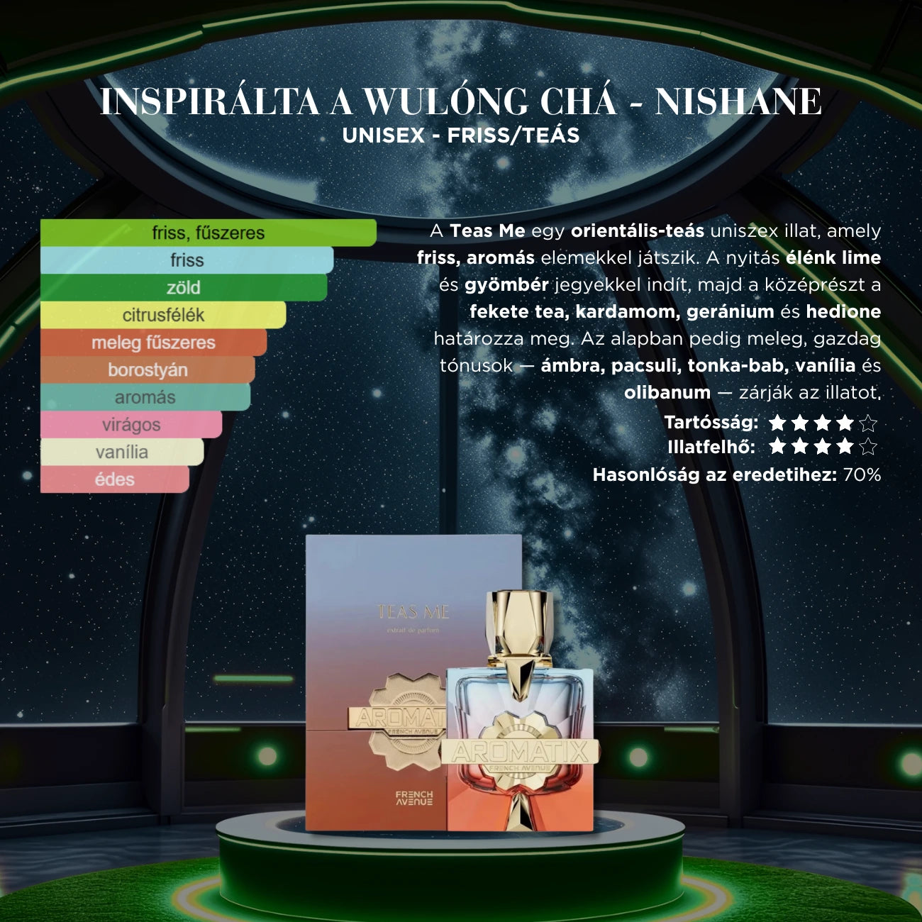 A Teas Me egy orientális-teás uniszex illat, amely friss, aromás elemekkel játszik. A nyitás élénk lime és gyömbér jegyekkel indít, majd a középrészt a fekete tea, kardamom, geránium és hedione határozza meg. Az alapban pedig meleg, gazdag tónusok — ámbra, pacsuli, tonka-bab, vanília és olibanum — zárják az illatot.
