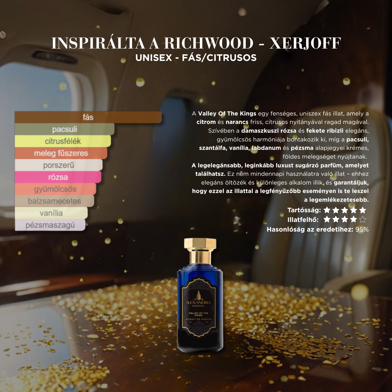 A Valley Of The Kings egy fenséges, uniszex fás illat, amely a citrom és narancs friss, citrusos nyitányával ragad magával. Szívében a damaszkuszi rózsa és fekete ribizli elegáns, gyümölcsös harmóniája bontakozik ki, míg a pacsuli, szantálfa, vanília, labdanum és pézsma alapjegyei krémes, földes melegséget nyújtanak.
